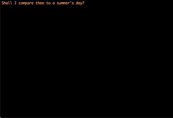 #include <ncurses.h> int main() { char t1[] = "Shall I compare thee"; char t2[] = " to a summer's day?"; initscr(); addstr(t1); /* add the first string */ addstr(t2); /* add the second string */ refresh(); /* display the result */ getch(); /* wait */ endwin(); return 0; }