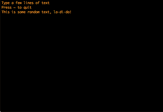 #include <ncurses.h> int main() { int ch; initscr(); addstr("Type a few lines of text\n"); addstr("Press ~ to quit\n"); refresh(); while( (ch = getch()) != '~') ; endwin(); return 0; }
