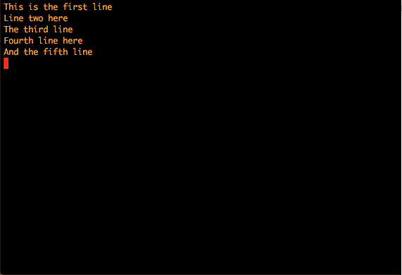 #include <ncurses.h> int main() { initscr(); /* add five lines */ addstr("This is the first line\n"); addstr("Line two here\n"); addstr("The third line\n"); addstr("Fourth line here\n"); addstr("And the fifth line\n"); refresh(); getch(); /* remove a line*/ move(2,0); deleteln(); refresh(); getch(); endwin(); return 0; }