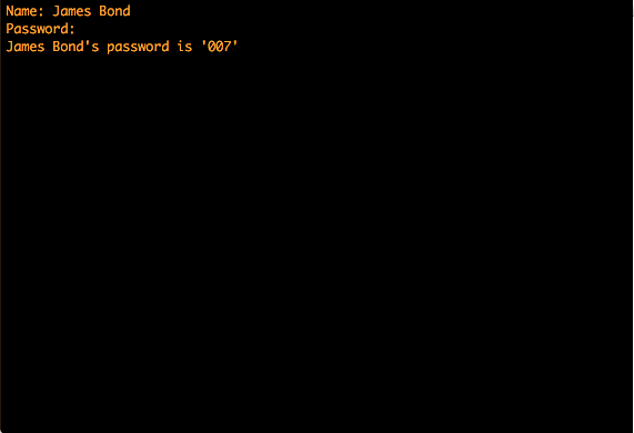 #include <ncurses.h> int main() { char name[32]; char password[32]; initscr(); addstr("Name: "); getnstr(name,32); /* disable text output */ noecho(); addstr("Password: "); getnstr(password,31); /* enable text output */ echo(); printw("%s's password is '%s'\n", name, password); refresh(); getch(); endwin(); return 0; }