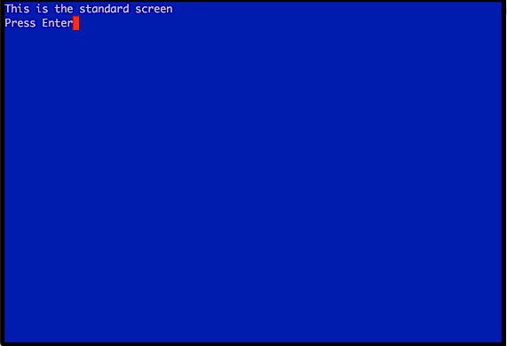 #include <ncurses.h> int main() { WINDOW *second; initscr(); start_color(); /* configure colors */ init_pair(1,COLOR_WHITE,COLOR_BLUE); init_pair(2,COLOR_WHITE,COLOR_RED); /* create the second window */ second = newwin(0,0,0,0); if(second == NULL) { endwin(); puts("Unable to create window"); return 1; } wbkgd(second,COLOR_PAIR(2)); waddstr(second,"This is the second window\n"); /* standard screen */ bkgd(COLOR_PAIR(1)); addstr("This is the standard screen\n"); addstr("Press Enter"); refresh(); getch(); /* show second window */ wrefresh(second); getch(); /* show standard screen again */ refresh(); getch(); endwin(); return 0; }